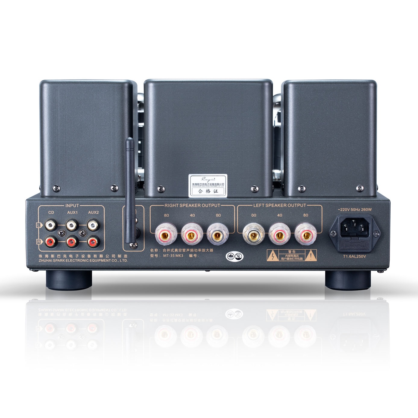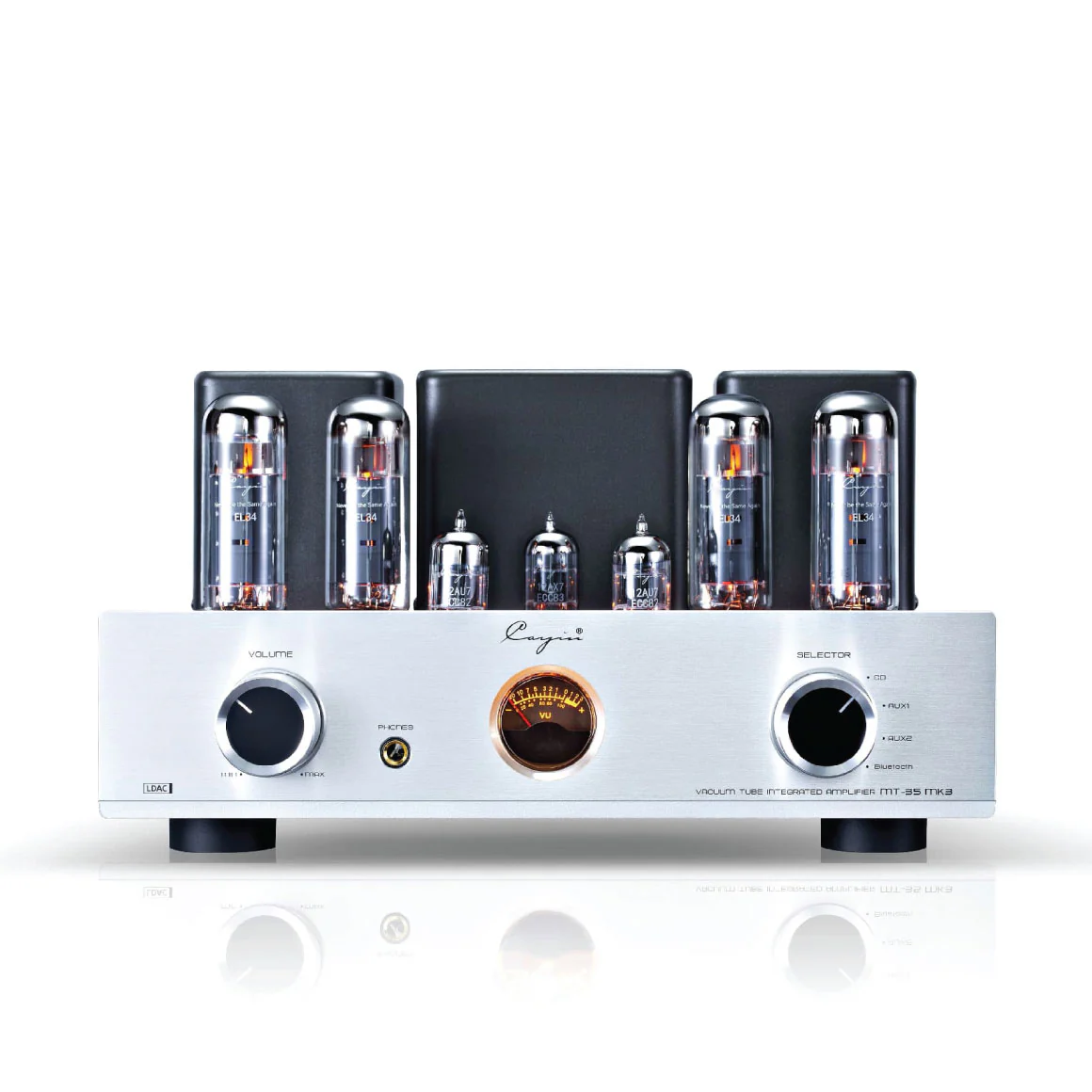 También incorpora un receptor Bluetooth para la reproducción inalámbrica directa de señales digitales. Gracias a Bluetooth 5.1 y códecs de alta calidad como AAC, aptX HD y LDAC, se garantiza una transmisión de alta calidad. Una salida de auriculares de tamaño completo en el panel frontal permite la conexión a auriculares estándar con una impedancia de 16 a 300 ohmios. El medidor VU central retroiluminado no solo le da al MT-35 MK3 un aspecto clásico y muestra el nivel de potencia actual, sino que también optimiza la polarización de cada válvula de potencia.