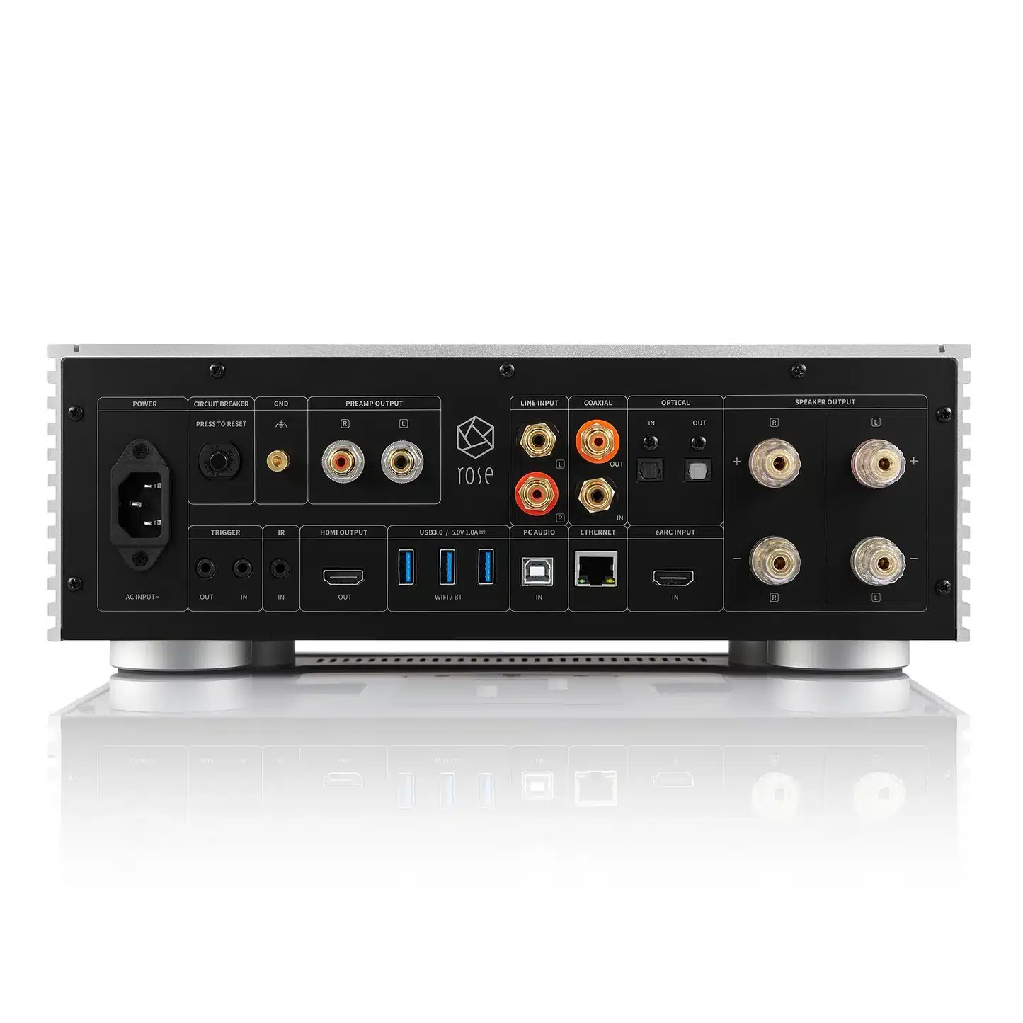 Otro elemento significativo de esta soberbia electrónica “todo en uno” es la Corrección del Factor de Potencia Activa (Active PFC) empleado en la fuente de alimentación, esencial para garantizar un suministro de energía extremadamente puro a los componentes de audio críticos. En lo que concierne a la sección de amplificación, el RS520 trabaja, al igual que el sensacional amplificador integrado estereofónico RA180, en la denominada Clase AD (“Advanced D”), que garantiza una linealidad excepcional en la totalidad de la entrega de potencia, gracias al uso de transistores FET basados en Nitruro de Galio (GaN) en vez de Silicio. Homologado Roon Ready, el nuevo HiFi Rose se completa con un ecualizador paramétrico de altas prestaciones y una generosa conectividad.