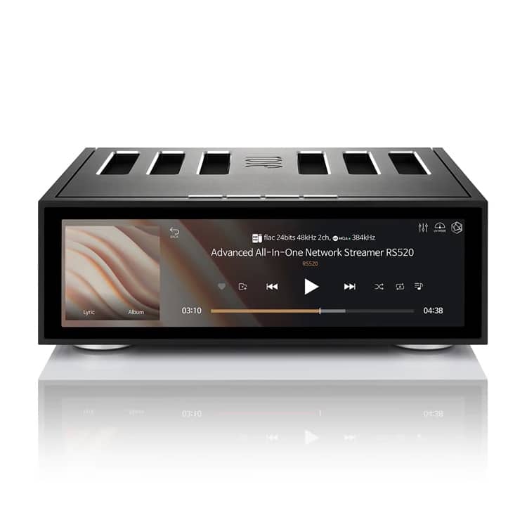 Como es habitual en el grueso de realizaciones de HiFi ROSE, la totalidad del panel frontal está ocupada por una pantalla de visualización LCD táctil de 12’6” (320 mm) y resolución 4K, que admite varias opciones de configuración dependiendo de la funcionalidad que esté siendo utilizada en cada momento. En el interior del RS520 lo que encontramos es una exhibición de tecnología punta materializada en la fusión de soluciones de ingeniería exclusivas y componentes premium. Así, en la sección DAC encontramos un amplificador operacional ejecutado con componentes discretos desarrollado por HiFi ROSE, con el objetivo de reducir aún más la distorsión y maximizar la naturalidad del sonido.