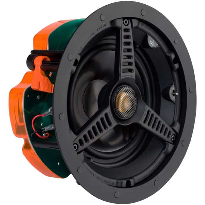 Tecnologías Radius HD para instalación en techo. Equipado con un altavoz de medios/graves con cono de MMPII de 165 mm (6.5″) y un tweeter de cúpula de C-CAM bañada en oro para ofrecer altas prestaciones sonoras, facilidad de ataque y una banda pasante y una dispersión muy amplias. La configuración y la imagen sonora óptimas se consiguen con la ayuda de un tweeter pivotante y un ajuste del nivel de agudos (+3 dB/0 dB/-3 dB).