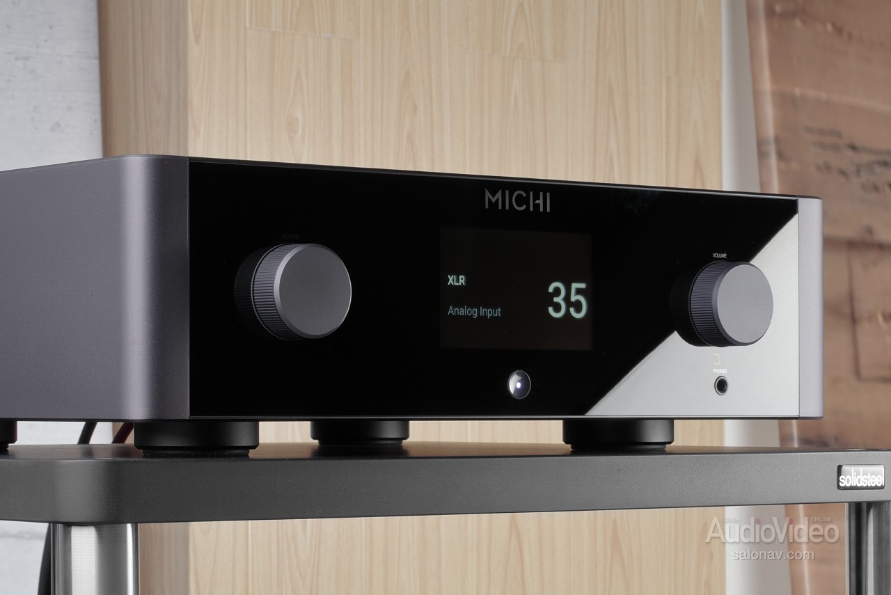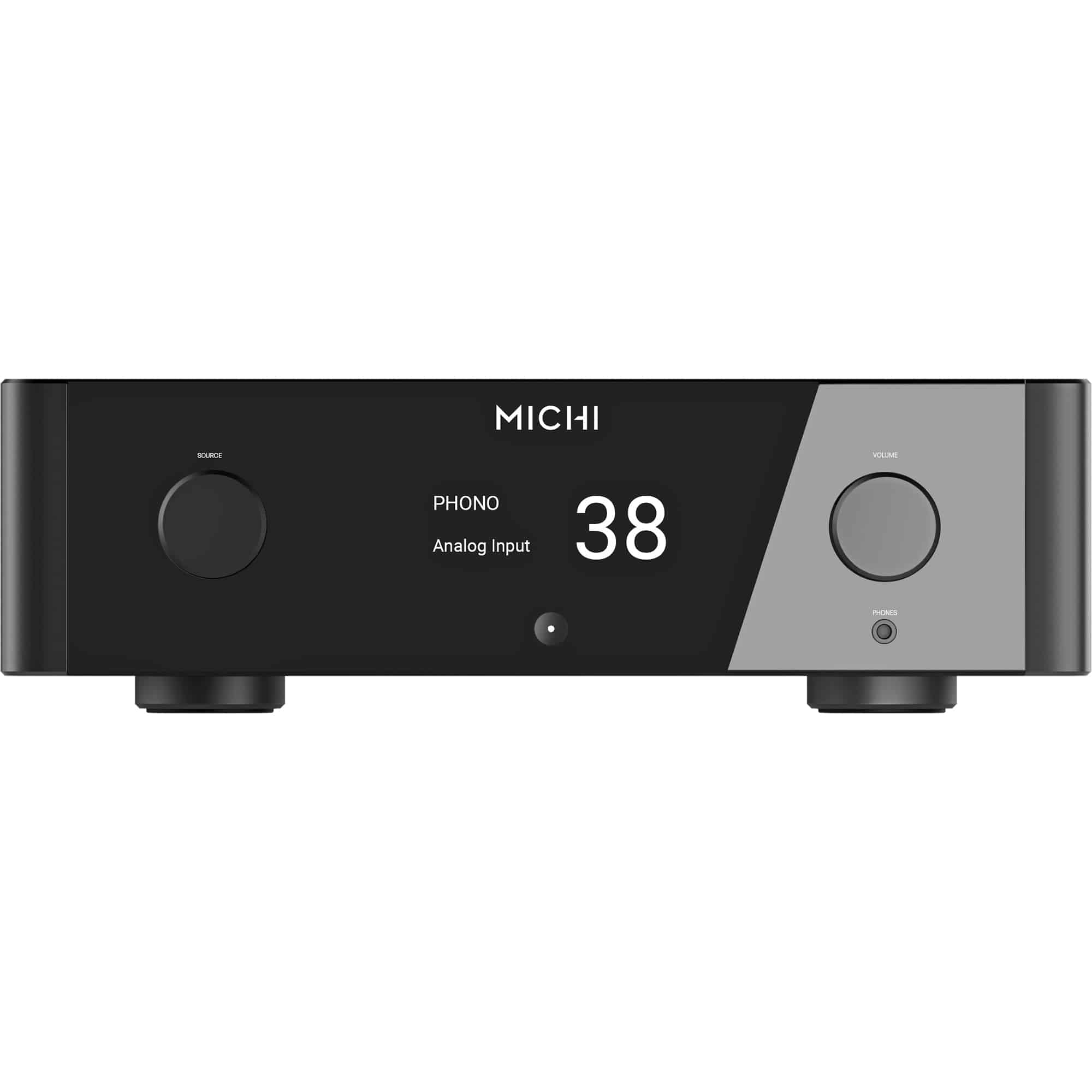 El elegante diseño industrial del Michi X3 Serie 2 se adapta cómodamente a cualquier espacio sin por ello dejar de suministrar 350 poderosos vatios para reproducir con maestría sus fuentes de música favoritas por vía analógica RCA, digital óptica, digital coaxial, PC-USB compatible MQA (24 bits/384 kHz), PCM (32 bits/384 kHz) y Quad DSD (11’2 MHz), analógica XLR balanceada e inalámbrica vía aptX™ HD Bluetooth. Los entusiastas del vinilo apreciarán rápidamente la entrada de fono para cápsulas de imán móvil (MM).